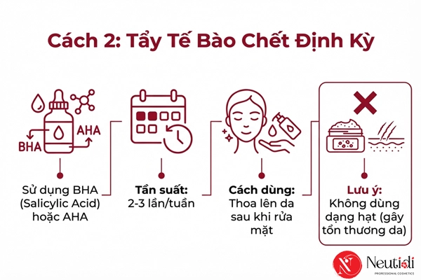 Lưu ý: Tuyệt đối không nên sử dụng tẩy tế bào chết dạng hạt vì có thể gây trầy xước da, đẩy vi khuẩn sâu vào lỗ chân lông. Khi dùng BHA/AHA, bắt buộc phải sử dụng kem chống nắng SPF 30+ vào ban ngày.