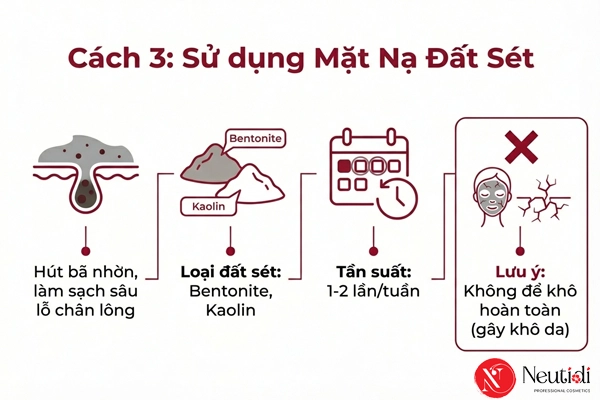 Có thể sử dụng mặt nạ đất sét (Bentonite hoặc Kaolin) để hút bã nhờn, làm sạch sâu lỗ chân lông mà không gây tổn thương da. Nên sử dụng 1-2 lần/tuần, thoa đều lên vùng da có mụn, để 10-15 phút khi đất sét còn hơi ẩm, sau đó rửa sạch bằng nước ấm.