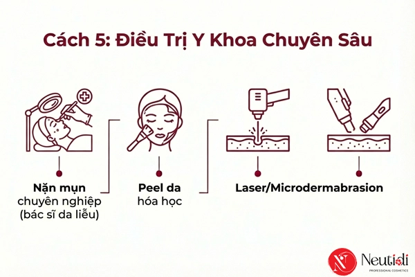 Với mụn đầu đen nặng, điều trị y khoa tại phòng khám da liễu là lựa chọn tối ưu. Bác sĩ sẽ nặn mụn chuyên nghiệp bằng dụng cụ vô trùng, loại bỏ mụn ngay lập tức mà không để lại sẹo. Peel da hóa học với Salicylic Acid 20-30% hoặc Glycolic Acid 30-70% giúp làm sạch sâu lỗ chân lông, cải thiện kết cấu da. Với mụn đầu đen lỗ chân lông to hoặc kèm sẹo lõm, Laser CO2 fractional hoặc Microdermabrasion sẽ phù hợp.