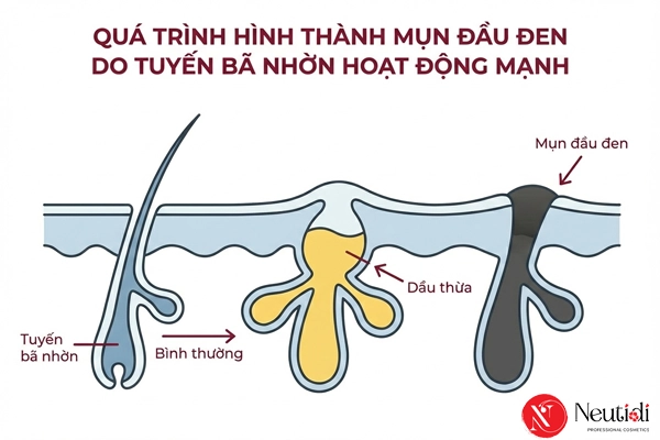 Tuyến bã nhờn hoạt động quá mức là nguyên nhân trực tiếp và quan trọng nhất dẫn đến mụn đầu đen. Khi tuyến bã nhờn sản xuất quá nhiều dầu, lượng bã nhờn dư thừa tích tụ trong lỗ chân lông, kết hợp với tế bào da chết tạo thành nút bít. Hoạt động của tuyến bã nhờn chịu ảnh hưởng mạnh từ yếu tố di truyền và loại da. Người có da dầu hoặc da hỗn hợp thiên dầu có tuyến bã nhờn tiết nhiều hơn, đặc biệt ở vùng chữ T, khiến vùng này trở thành “ổ” mụn đầu đen.