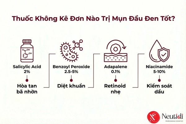 | Salicylic Acid 2% | Hòa tan bã nhờn, thẩm thấu sâu lỗ chân lông | Khuyến nghị hàng đầu cho mụn đầu đen |