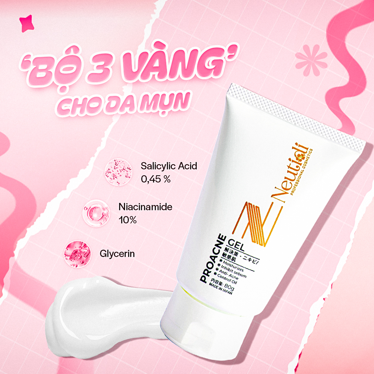 Với công thức chứa Salicylic Acid 0,45%, Niacinamide và Glycerin, Neutidi Proacne Gel mang lại giải pháp toàn diện cho làn da đang gặp phải tình trạng mụn viêm, mụn đầu đen và lỗ chân lông to. Giúp dưỡng ẩm, làm mịn và cải thiện bề mặt da, hỗ trợ làm giảm mụn và ngăn ngừa hình thành mụn trứng cá, mụn đầu đen, mụn đầu trắng.