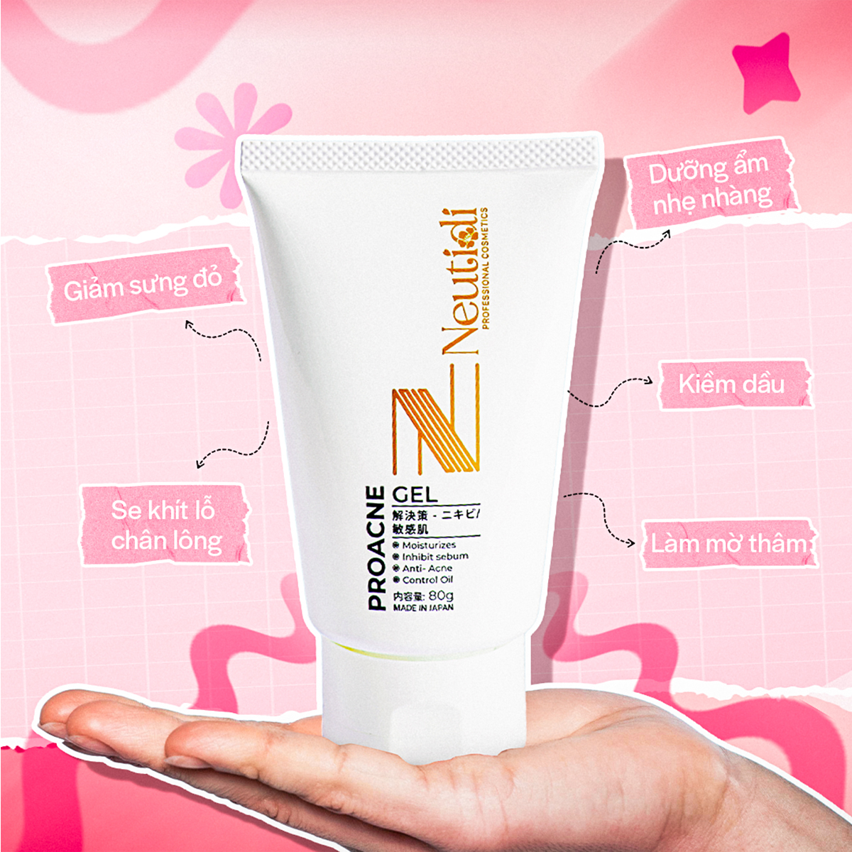 Neutidi ProAcne Gel được thiết kế chuyên biệt cho da dầu mụn & da dễ kích ứng, tập trung vào làm dịu – dưỡng ẩm – ngăn ngừa mụn tái phát. Sản phẩm không chỉ giúp cải thiện tình trạng mụn trứng cá (mụn viêm, mụn đầu đen, mụn đầu trắng) mà còn tăng tốc phục hồi làn da, giảm thâm mụn và giữ ẩm cân bằng.