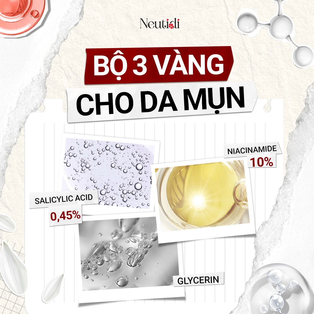 Hoạt chất đa công dụng: kiểm soát dầu thừa, làm dịu viêm đỏ, thu nhỏ lỗ chân lông và cải thiện kết cấu da. Niacinamide còn cân bằng độ ẩm tự nhiên, giúp da mụn không bị khô căng trong quá trình điều trị.
