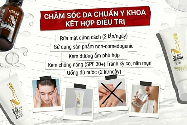 Chăm sóc da chuẩn y khoa kết hợp điều trị là việc thực hiện quy trình làm sạch, dưỡng ẩm và bảo vệ da đúng cách bằng các sản phẩm dược mỹ phẩm lành tính để hỗ trợ thuốc phát huy tác dụng tối đa. Hơn nữa, một làn da được chăm sóc tốt sẽ có hàng rào bảo vệ vững chắc, giảm thiểu kích ứng do thuốc trị mụn gây ra.