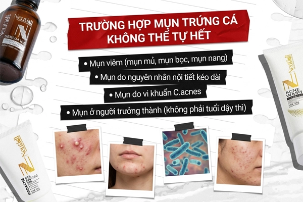Trường hợp mụn trứng cá không thể tự hết bao gồm các loại mụn có ổ viêm sâu, mụn mủ, mụn bọc, mụn nang và các tình trạng mụn dai dẳng do nguyên nhân bệnh lý hoặc nội tiết tố phức tạp. Nếu không được can thiệp y tế bằng thuốc hoặc thủ thuật, các ổ viêm này sẽ không chỉ tồn tại mãi mà còn phá hủy cấu trúc trung bì da, dẫ đến sẹo vĩnh viễn.