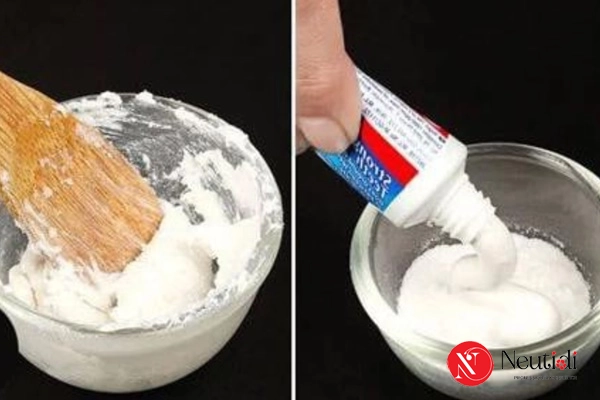 Nguyên liệu: 1 thìa cà phê kem đánh răng trắng + ½ thìa muối tinh hạt mịn (không dùng muối hạt thô).